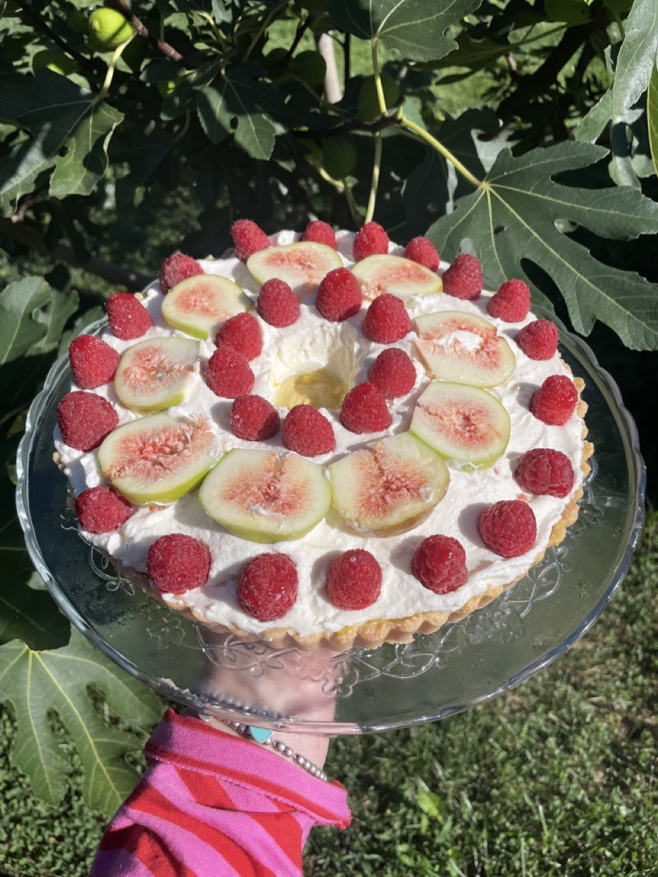 I had a real Fun creating this beautiful delicious dessert. Added Orange liquor from Spain while making the lemon curd. I chose to add whipped cream cheese with cream (from another of my favorites Nigella’s Guinness Cake recipe) , my homemade vanilla extract and some powdered sugar and decorated it with figs from my tree which goes so well with raspberries and lemon curd. Thank you for giving me a chance to create!
