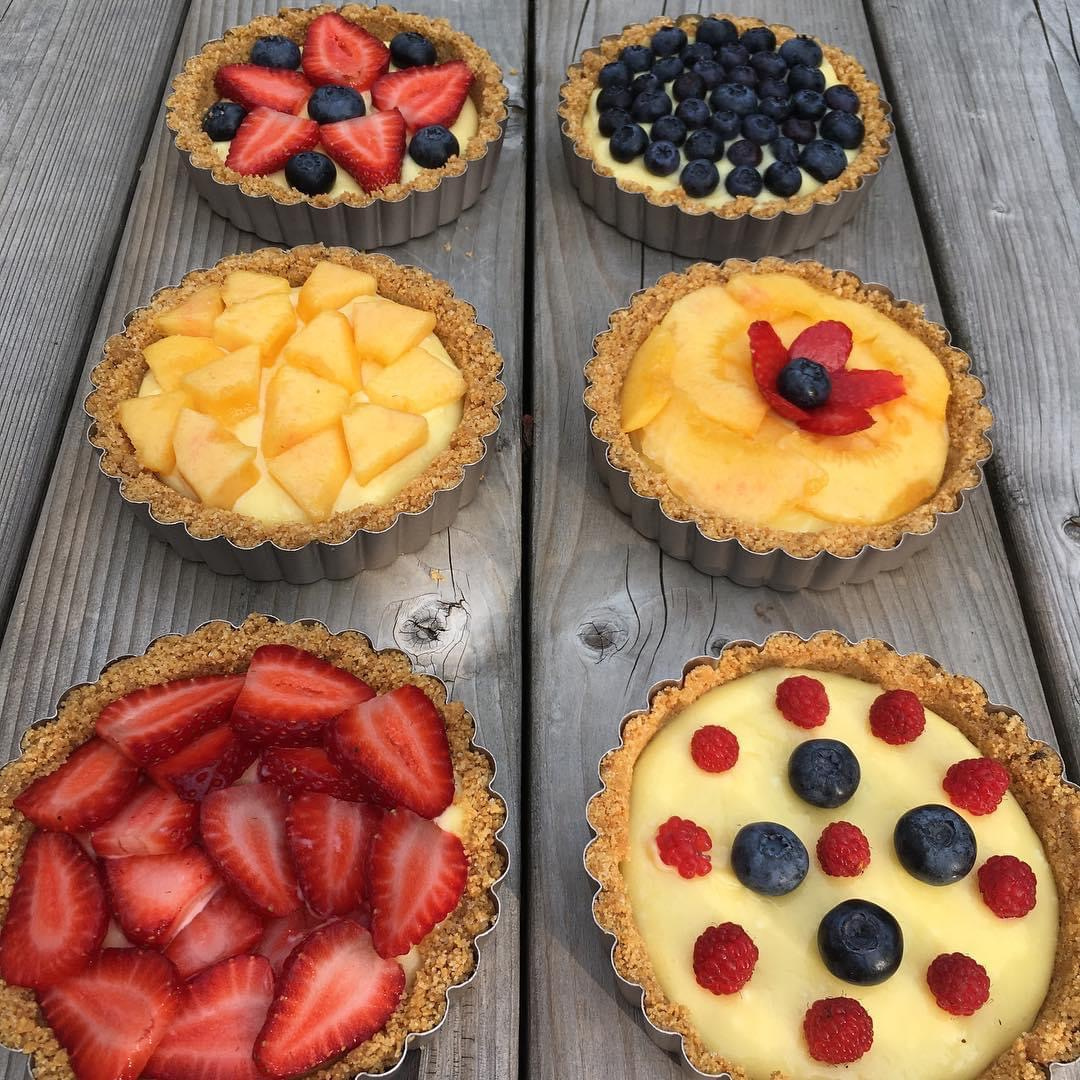 This is my favorite summer recipe!! I added a little cinnamon and ginger to the crust to spice it up and used all fresh local berries and peaches to top them. I made individual tarts for everyone at the party, cheers!!