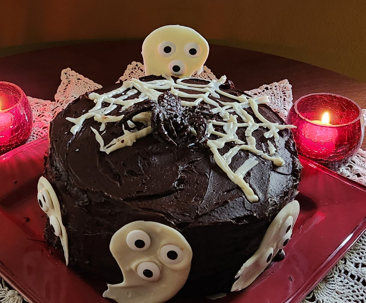 Love making this cake for my Halloween loving grandson. Chocolate, ghosts and spiders- a hit all around. Have a spooky October.