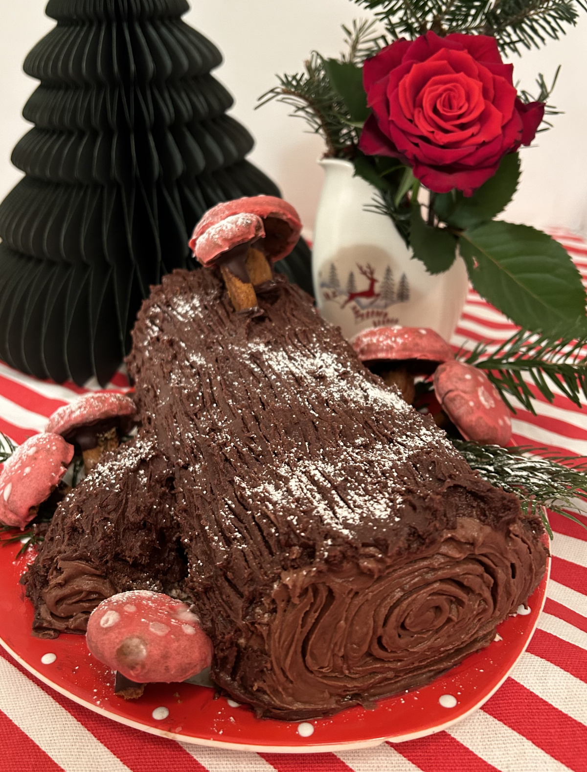 Vegan Bûche de Noël I replaced the eggs with aqua faba to make a light chocolate vegan sponge - I’m not going to lie it cracked terribly when rolled but the icing (using vegan butter) glued it back together again! I added gingerbread mushrooms to create an enchanted forest feel for a magical Christmas centre piece. Thanks Nigella! ????????❤️