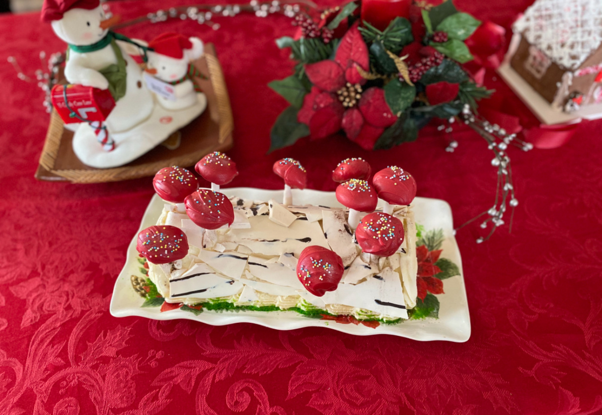 Edible white chocolate Yule Log with red cookie mushrooms, to bring in the holiday festivities and the start of a new season.