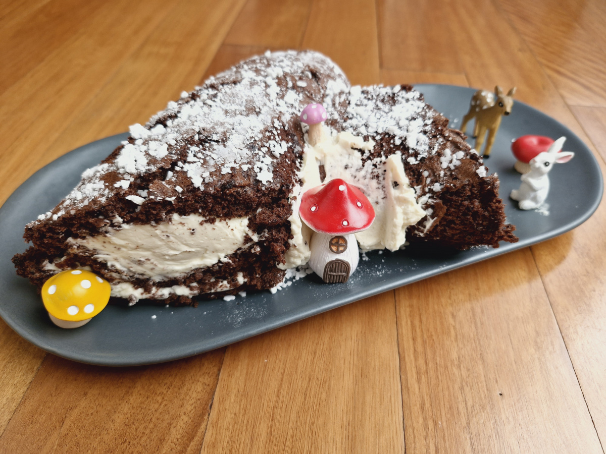 Can anyone believe that a member of my family is not fond of chocolate? I loved this recipe which gave me success in my very first yule log attempt ever! Since Christmas is about sharing & inclusiveness, I took the liberty of making a vanilla chantilly for the inside to please the non-chocoholics, & kept it simple outside with a snowing of icing sugar. My daughter added her woodland animals to the creation, definitely making it a fun, festive, inclusive & delicious affair!