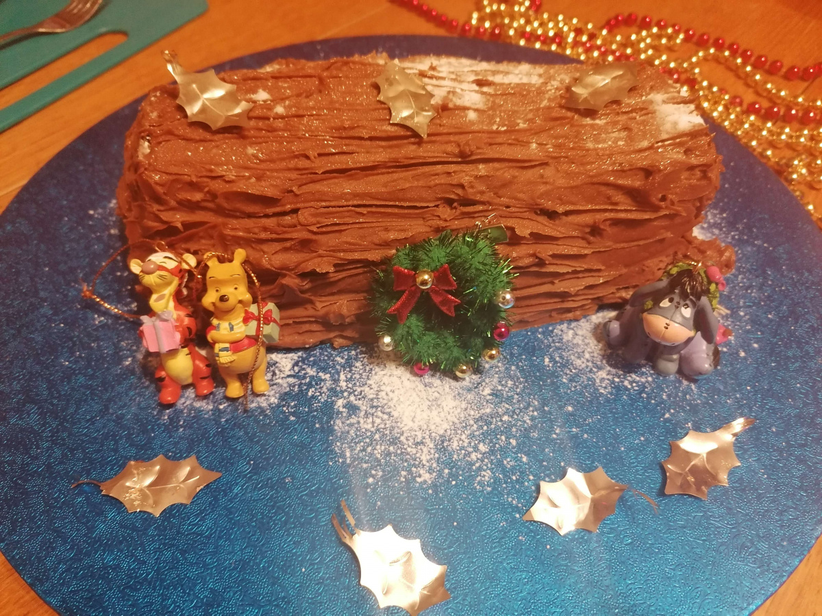 Our Hundred Acre Wood yule log. We loved making this and the children got involved. Nigella's recipe was easy to follow, the sponge was light, the buttercream was delicious. We added fresh whipped cream in the centre as we had some open that needed to be used. Dad made the sponge, our eldest daughter made the buttercream and our younger children decorated it with Winnie the Pooh characters from the tree. Simple and delicious and something special for our Christmas table. Thanks Nigella :)