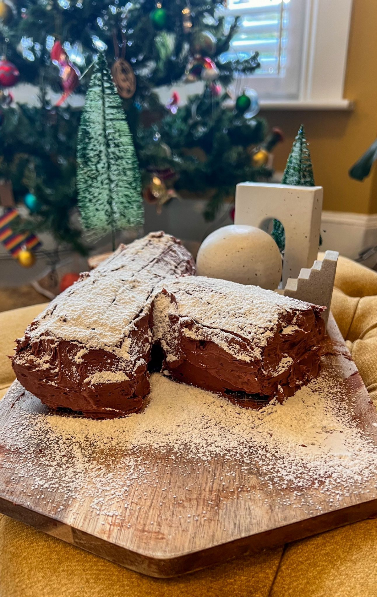 I am not a fan of chocolate cake, I think it is stodgy, too rich, boring and a cop out but there is something about this chocolate yule log that works so much better than normal. To cut through the richness I added some blackberry jam as I was making the chocolate buttercream which added a subtle sweet top note. To decorate I used the basic icing sugar & cornflour mixture/niege as well as some artful ceramics made by my favourite Melbourne Ceramic Artist Oh Hey Grace.