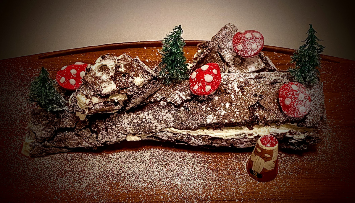 Ringing in the holidays with amanita mushrooms, fur trees, and Santa. Our Christmas Eve celebration with our annual yule log filled with whipped cream and showered in powdered sugar.