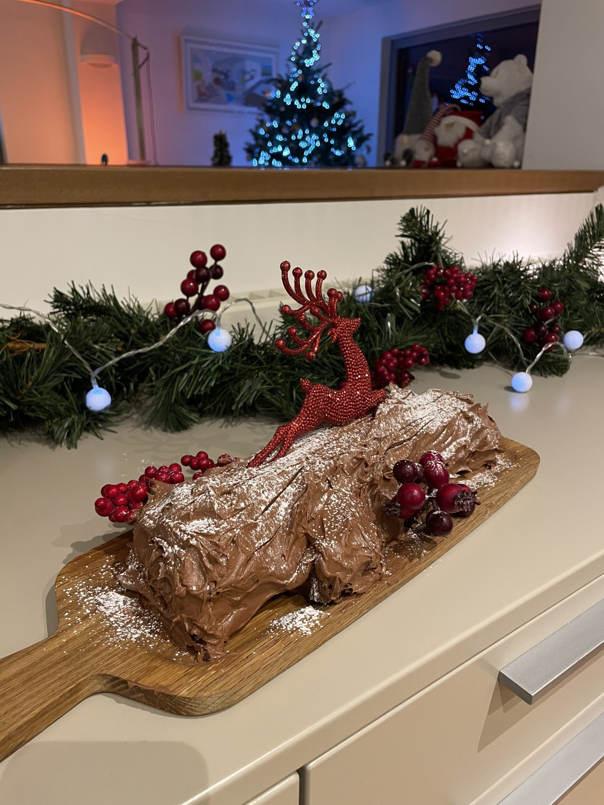 I have been making Nigella's Bûche de Noel for many many years, since I first had her Feast book. This will be the first of two or three I will make over the Christmas season no doubt - my family never tire of it! My sister is a coeliac so the fact that it is gluten-free is a bonus. This time I decided to decorate with a sparkling red reindeer and some red berries...