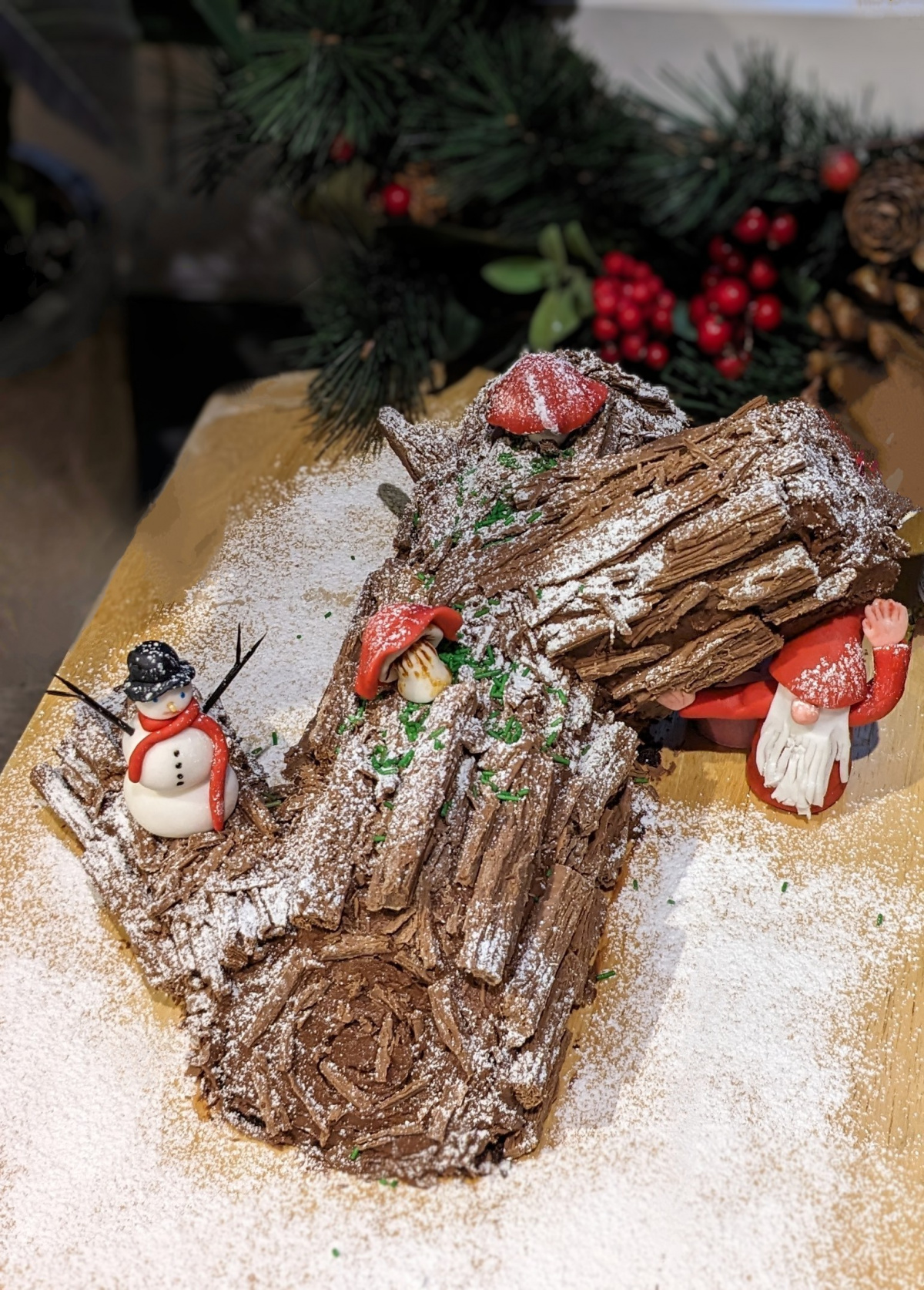 Merry Christmas! Had lots of fun making the sugar paste figures, and used flakes to make the bark as realistic as possible!