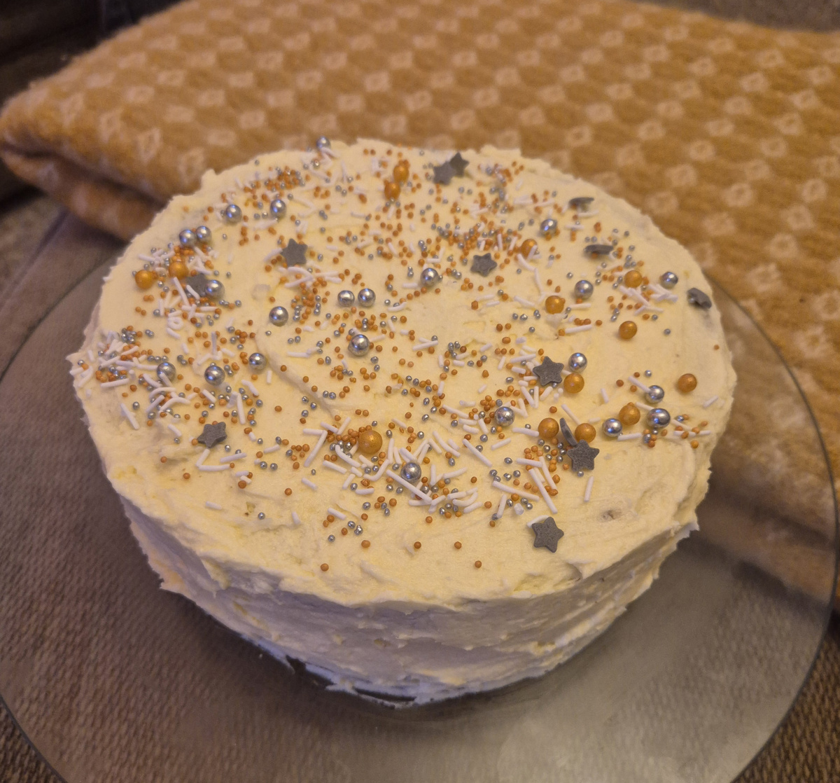 I was very concerned looking at the gloopy mixture that would become the icing but just as nigella said it transformed into beautiful white icing!! I gave my cake a few sprinkles after all it is nearly christmas!!