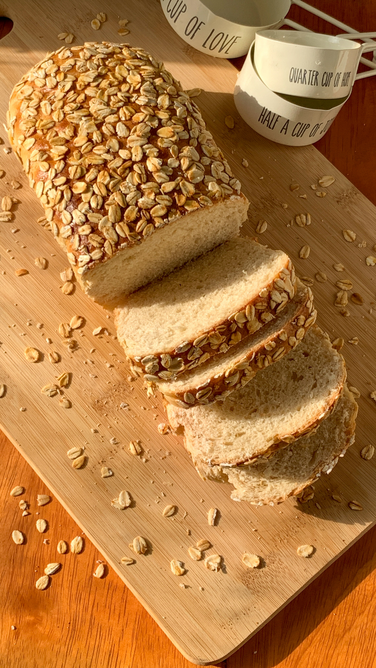 I always add seeds or oats on top of my bread loaves- they add a beautiful texture to them. My go to combination of this rustic, old-fashioned sandwich loaf is with a layer of unsalted butter, a drizzle of honey and some sea salt.