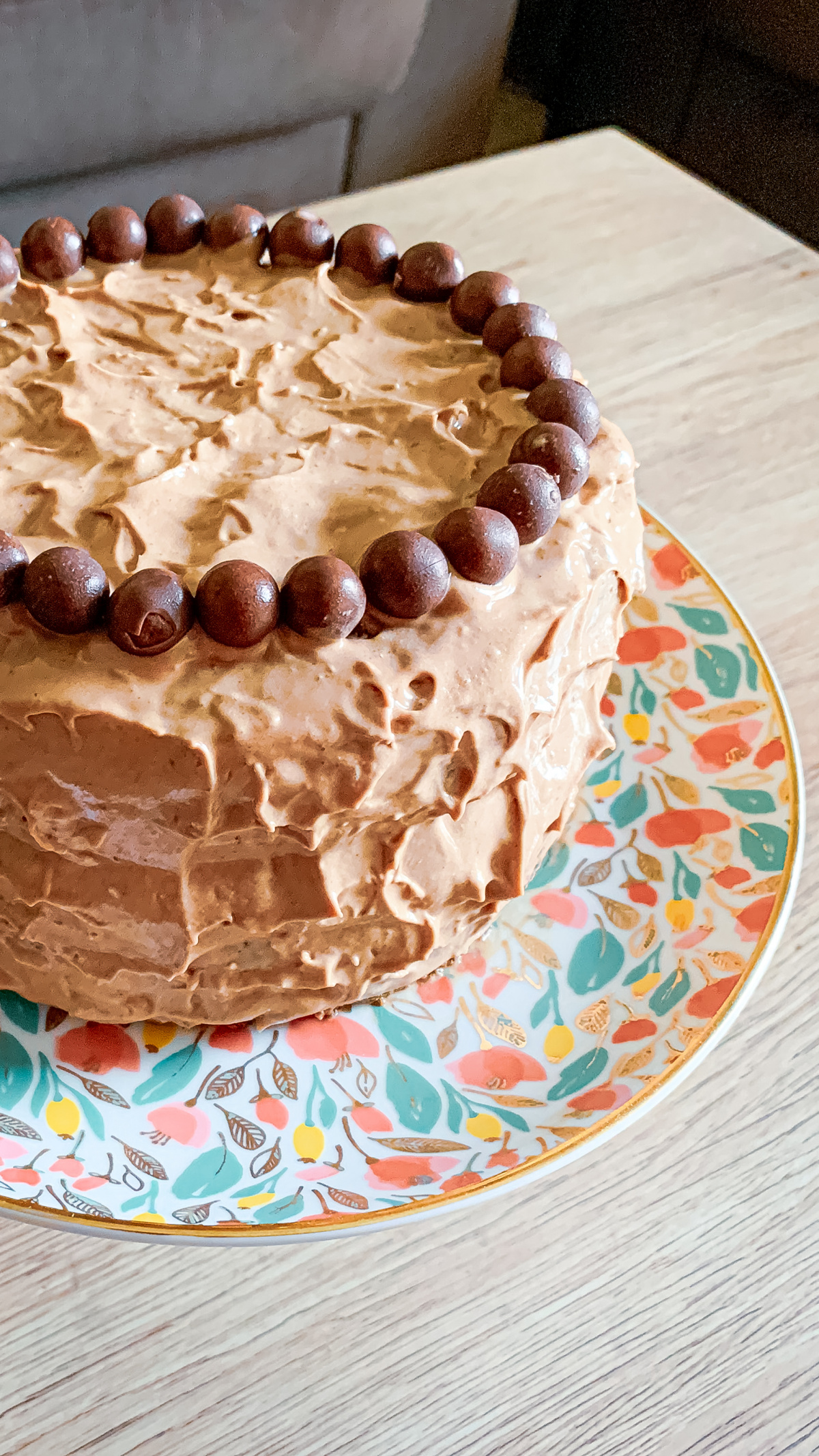 Walnut cake, coffee frosting and some maltesers on top - the best! I went for a rustic look because homemade cakes looks the best in their homely form.