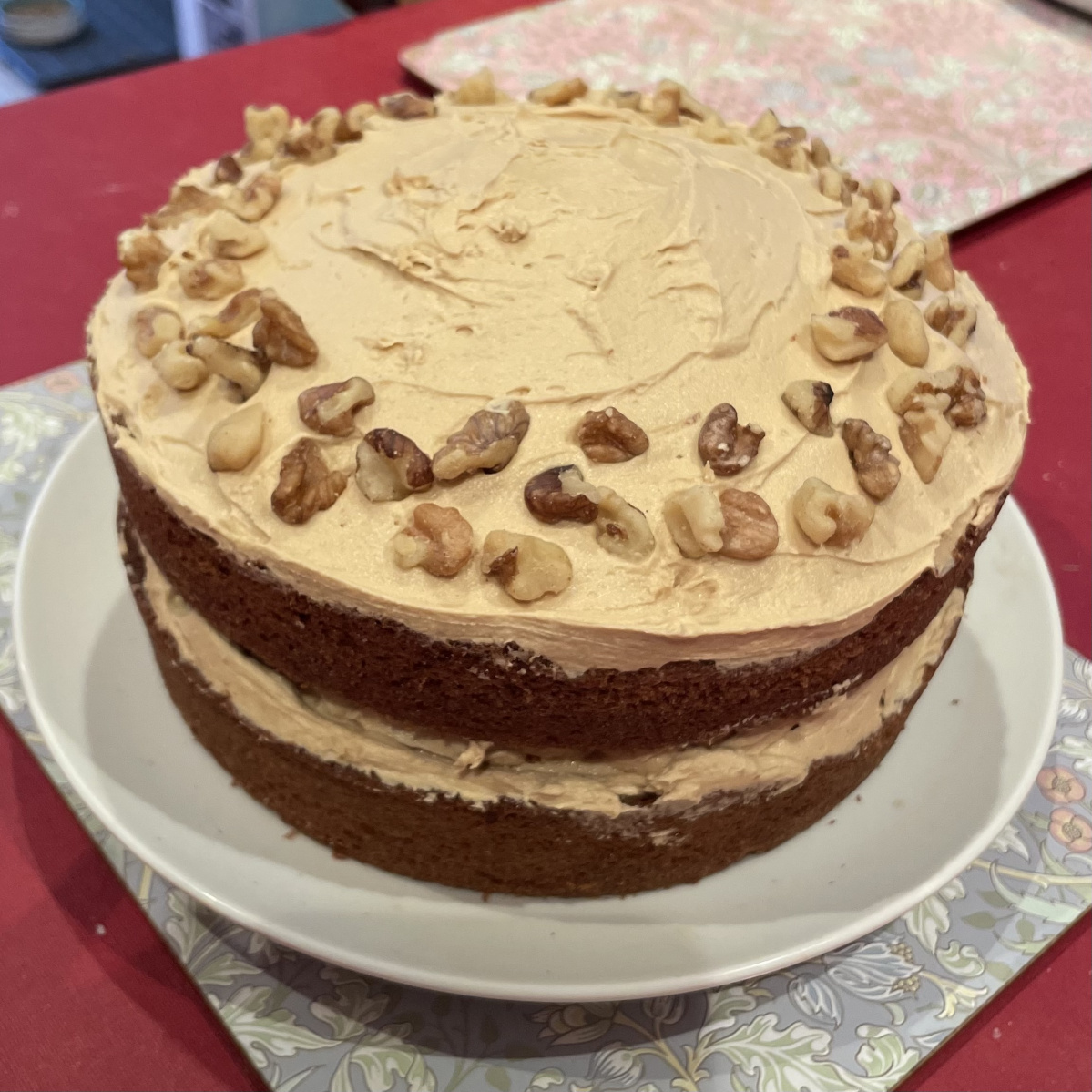 I made this in my stand mixer rather than a food processor. I only had chopped walnuts rather than halves, so I added some nuts on top of the buttercream between the cake layers. It was a great addition to the texture!