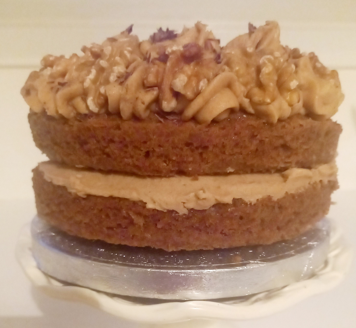 Nigella's Coffee and Walnut cake made for me and Sister in Memory of Mum as it was always her favourite cake. I made a cute 6 inch layered cake ...perfect for the two of us to indulge on Dad's 86th Birthday... a beautiful cake full of happiness ...just added some dark chocolate shavings.