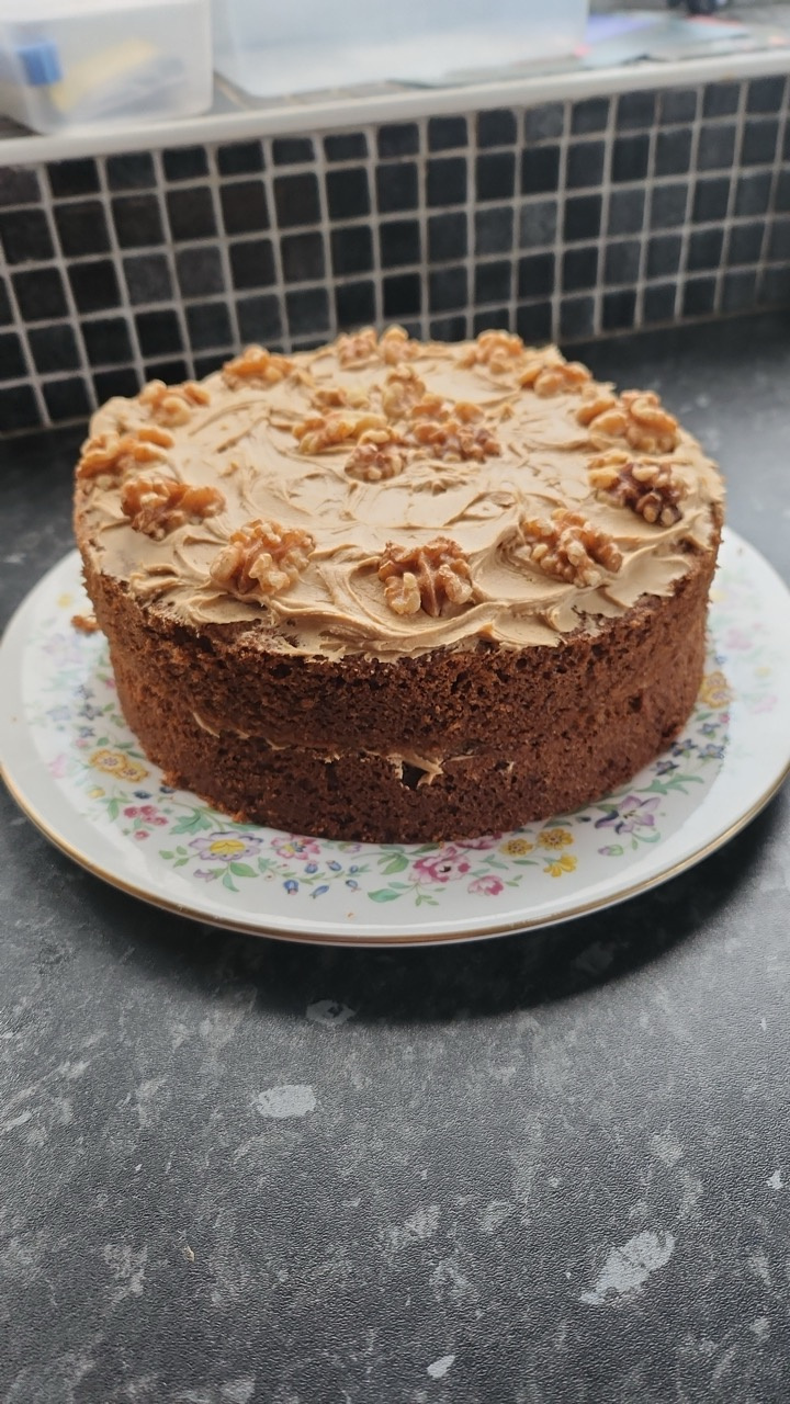 Delicious light and fluffy coffee and walnut cake. A few extra walnuts on top as I love them. I loved how blitzing the walnuts with the sugar created a nutty flavour throughout.