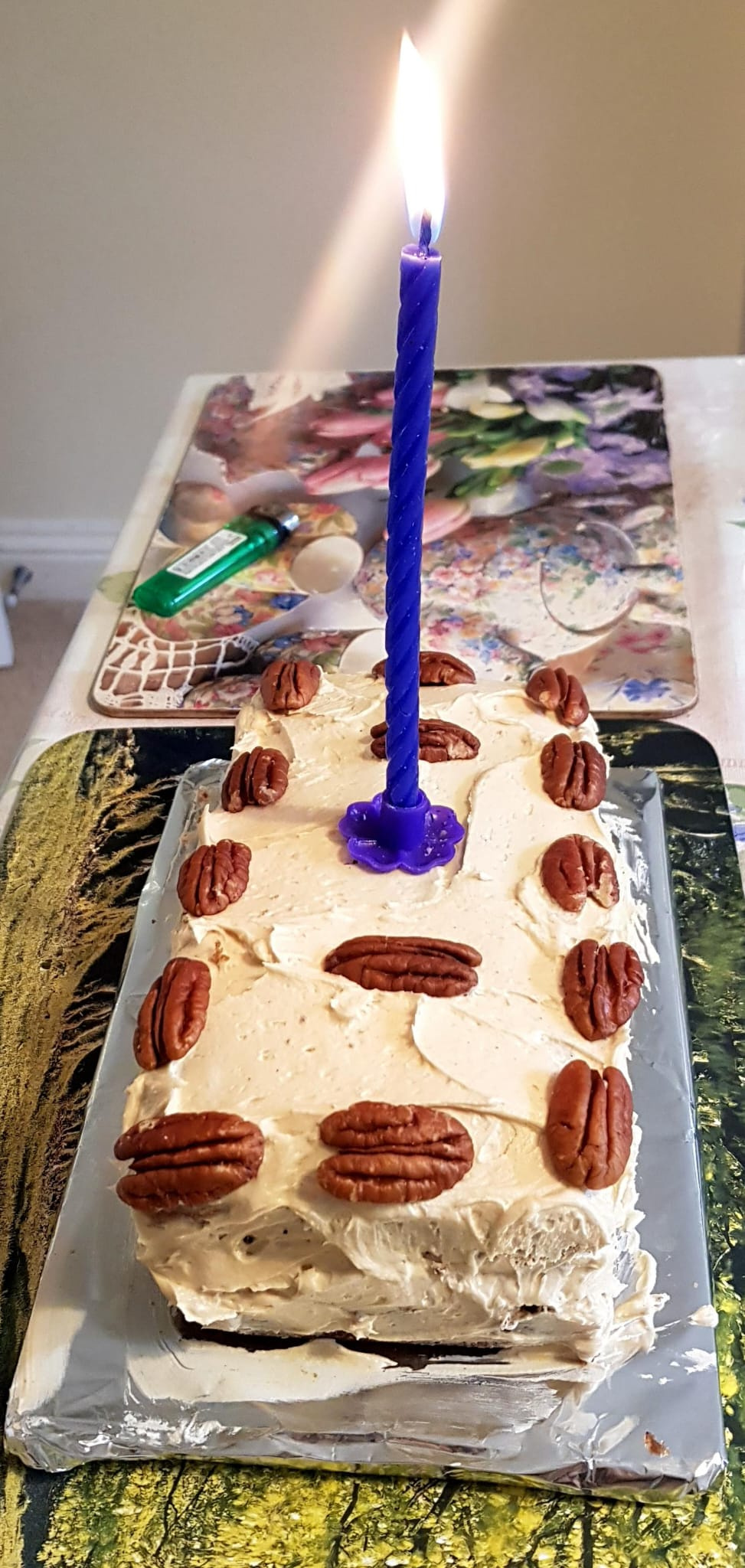 I made this cake as a loaf (halving all ingredients), for my Dad's birthday, decorating it with pecans rather than walnuts!