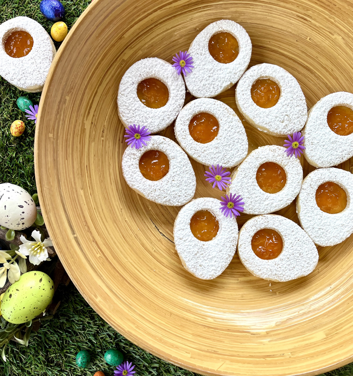 These Easter egg biscuits were so quick and easy to make. The dough was a pleasure to work with and the apricot jam glistened beautifully through its sugared window frame. They were a lovely addition to our Easter table.