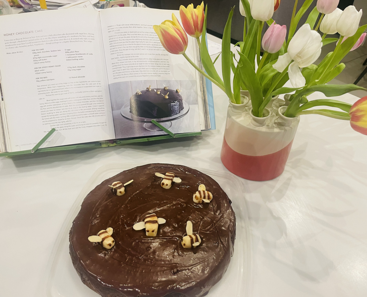 Lovely cake to make on a sunny day with the bees buzzing around the spring flowers in the garden. Made little slices with a knife to slide the almonds in to the marzipan more easily. Tastes delicious!