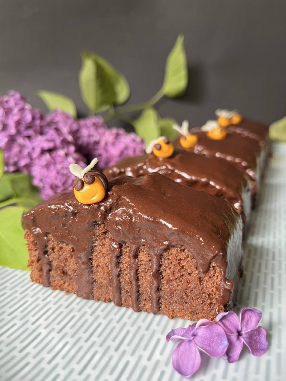 I opted for individual pieces of cake. The bees are made from modeling chocolate because I didn't have any marzipan at home. The cake is very moist, but next time I would use a little less sugar.
