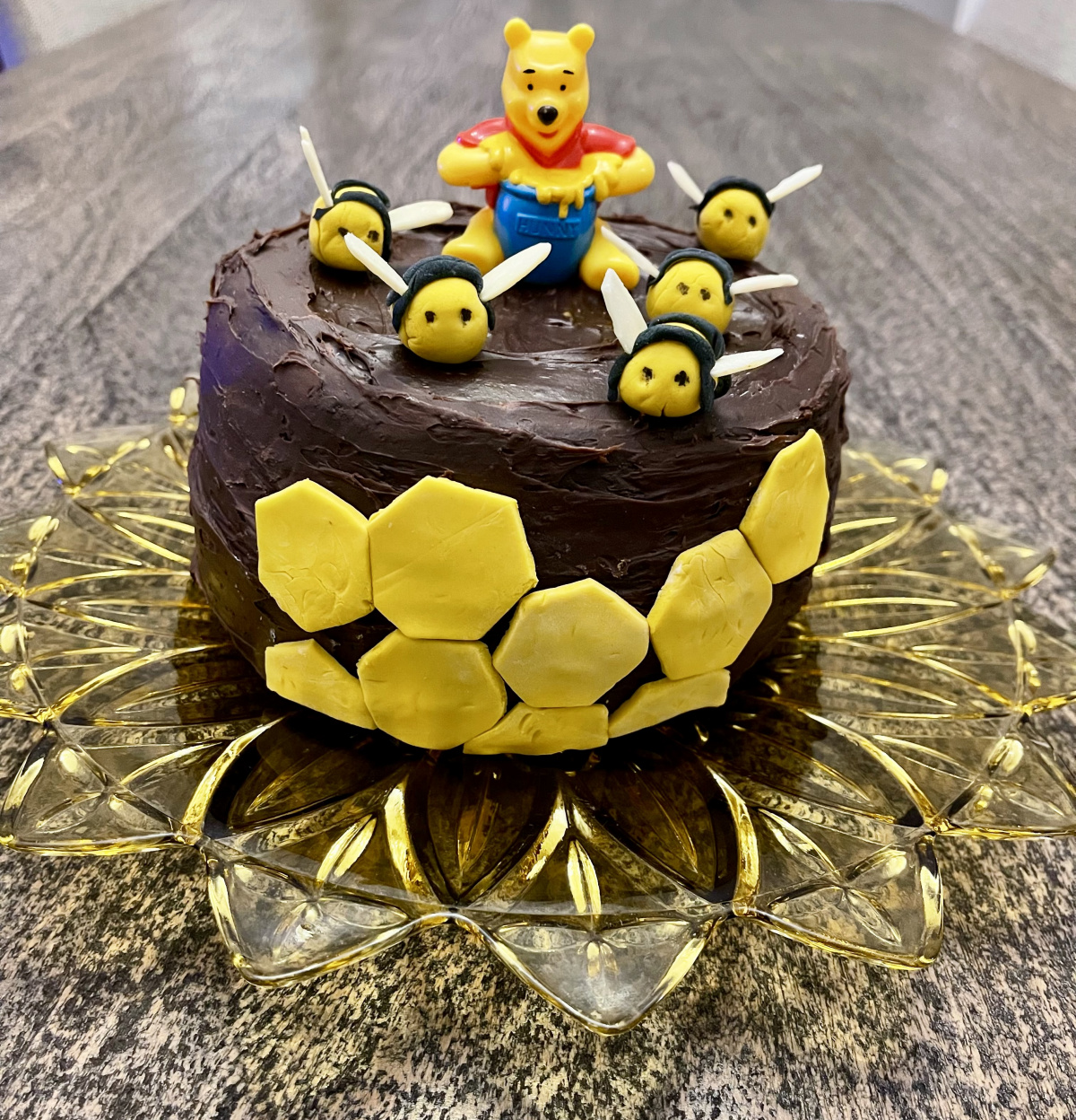 Phew, this was hard work, not perfect, but totally worth it. Honey chocolate cake with fondant honeycomb on the side, marzipan bees and the all famous honey eating Winnie the Phoo figurine. Can’t wait to try it.