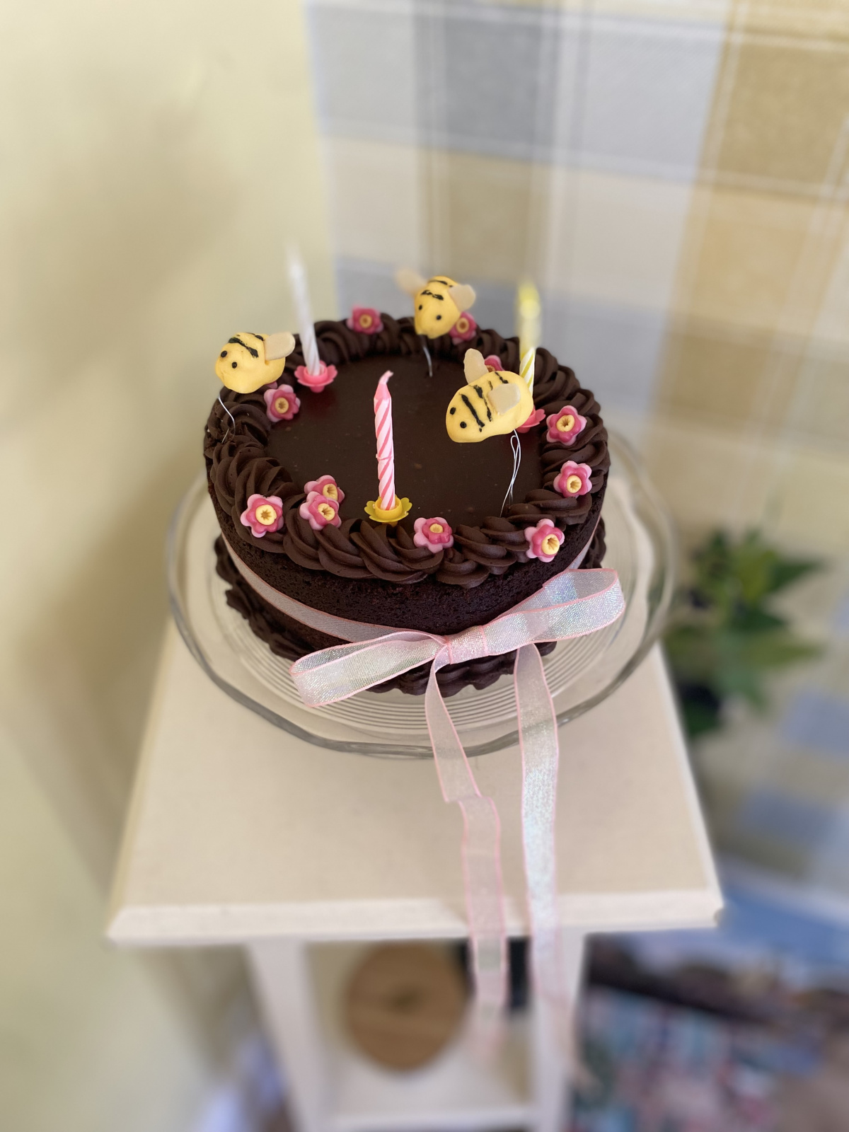 Honey chocolate cake from Feast, delicious Birthday cake that had a little bit of a dippy middle so I buttercreamed the edge to make a chocolate honey pond with the frosting and wired the buzzy bees Thank you Nigella delicious as always x