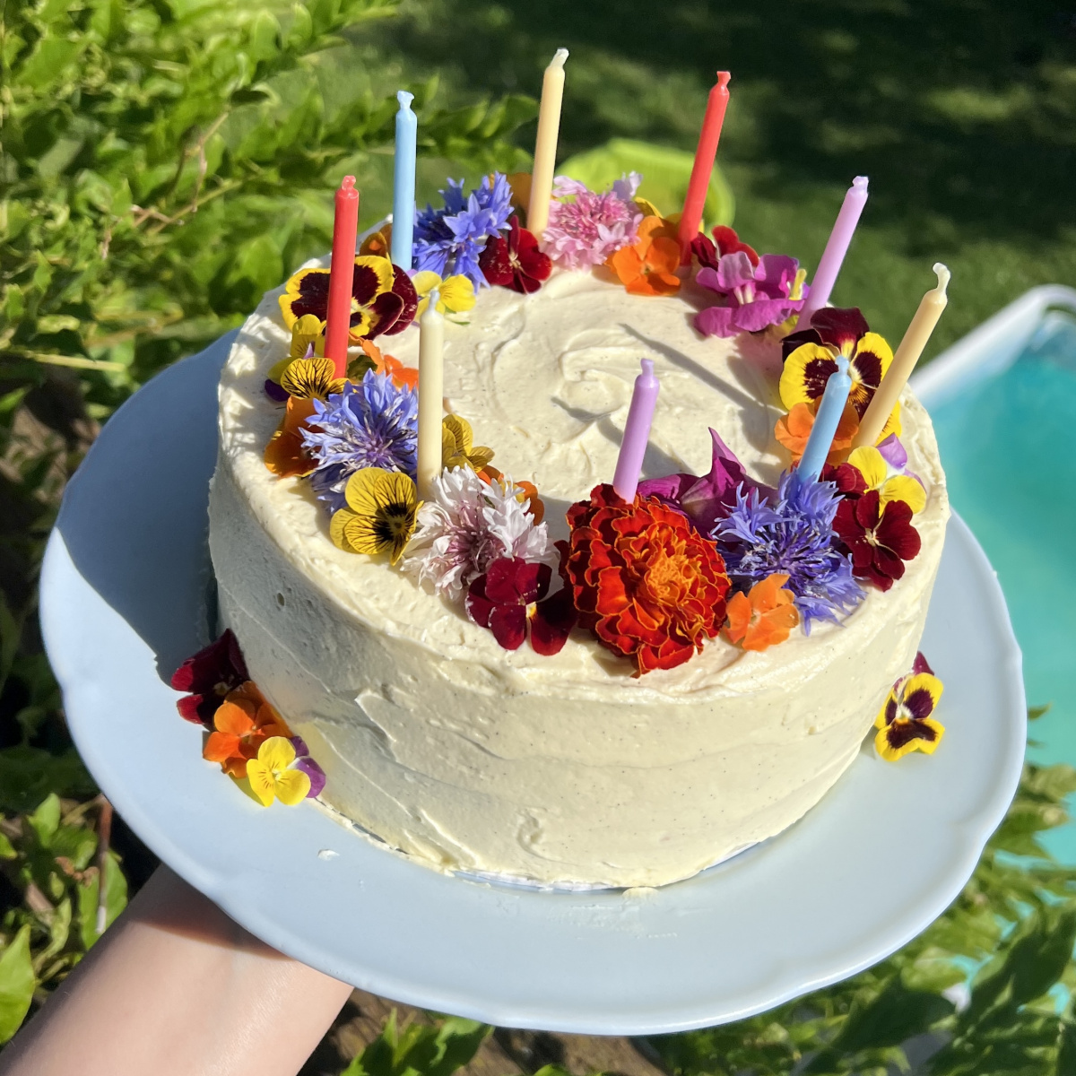 I made Nigella’s Vanilla Layer Cake with Ermine Icing for my sister’s birthday. She loved it! Decorating it was so much fun – the bright white frosting made the perfect canvas for all the colourful edible flowers. It looked super cheerful and tasted just as good. Definitely a new favourite :)