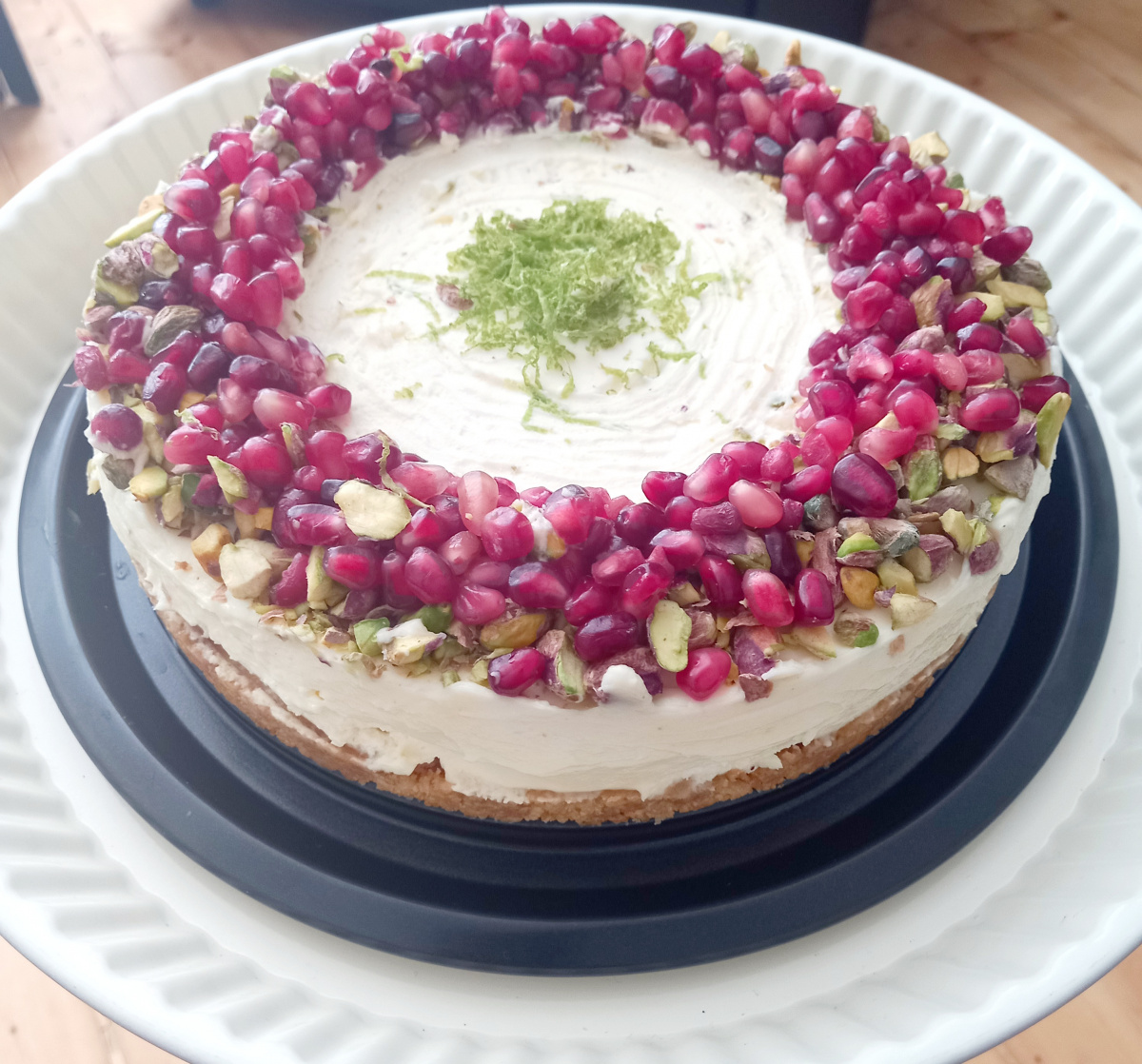 Nigella's White Chocolate Cheescake was my choice for a hot Summer's day. Creamy Belgian White Chocolate cheesecake filling on top of a crushed stem ginger biscuit base. Added crystallised and ground ginger for extra zing with pistachios and pomegranate seeds to bring a colourful summer vibe.