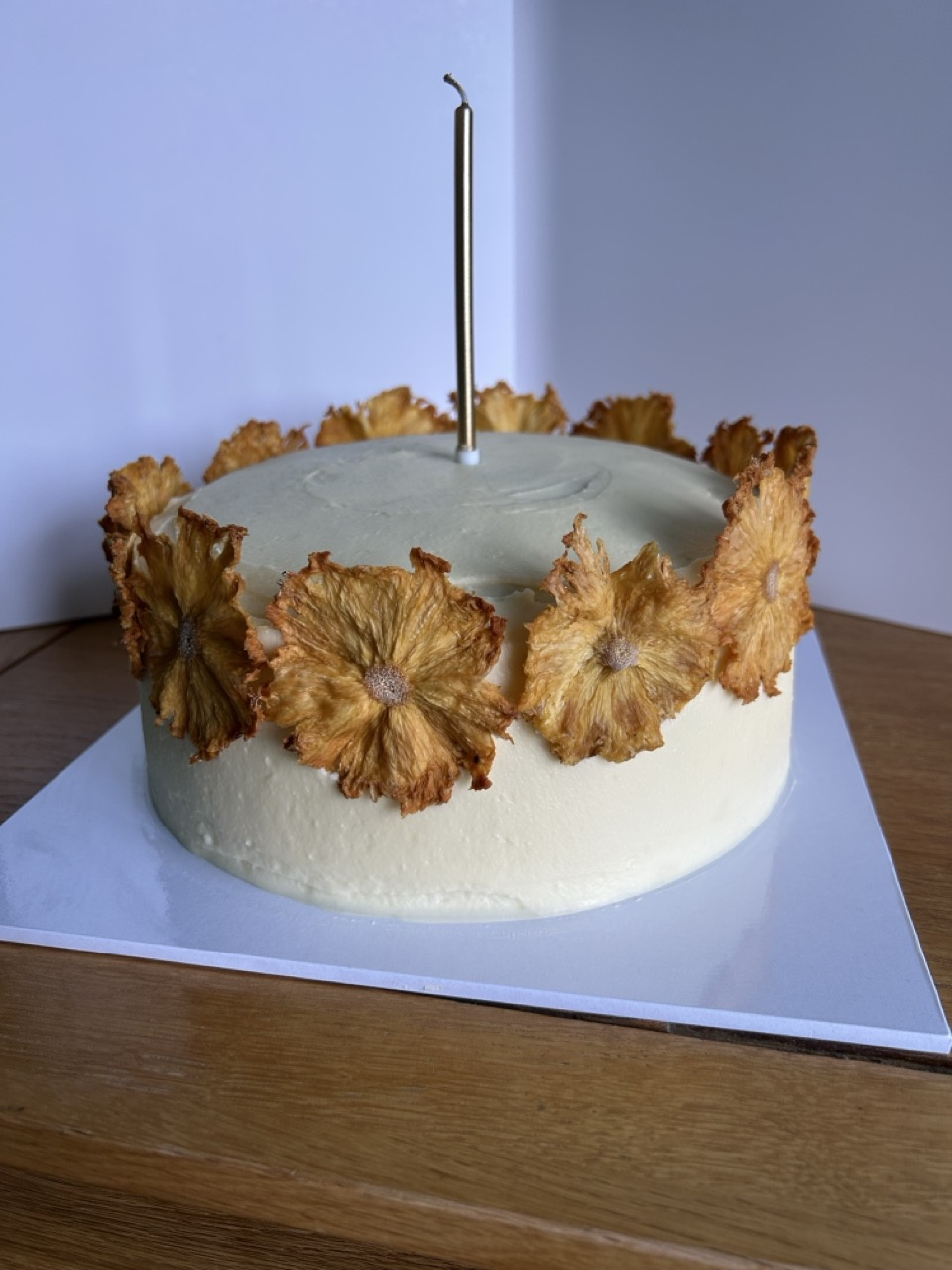 This is a gluten free version of Nigella’s ginger and Walnut Carrot Cake that I made for my mum’s birthday. I made it 3-tiered and covered entirely in the ginger, cream cheese icing. I crowned it with dried pineapple ‘flowers’ as decoration and topped with a single candle.
