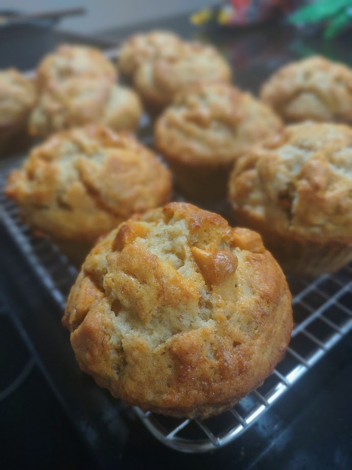 I made Nigella's banana butterscotch muffins. Butterscotch chips go so well with banana!
