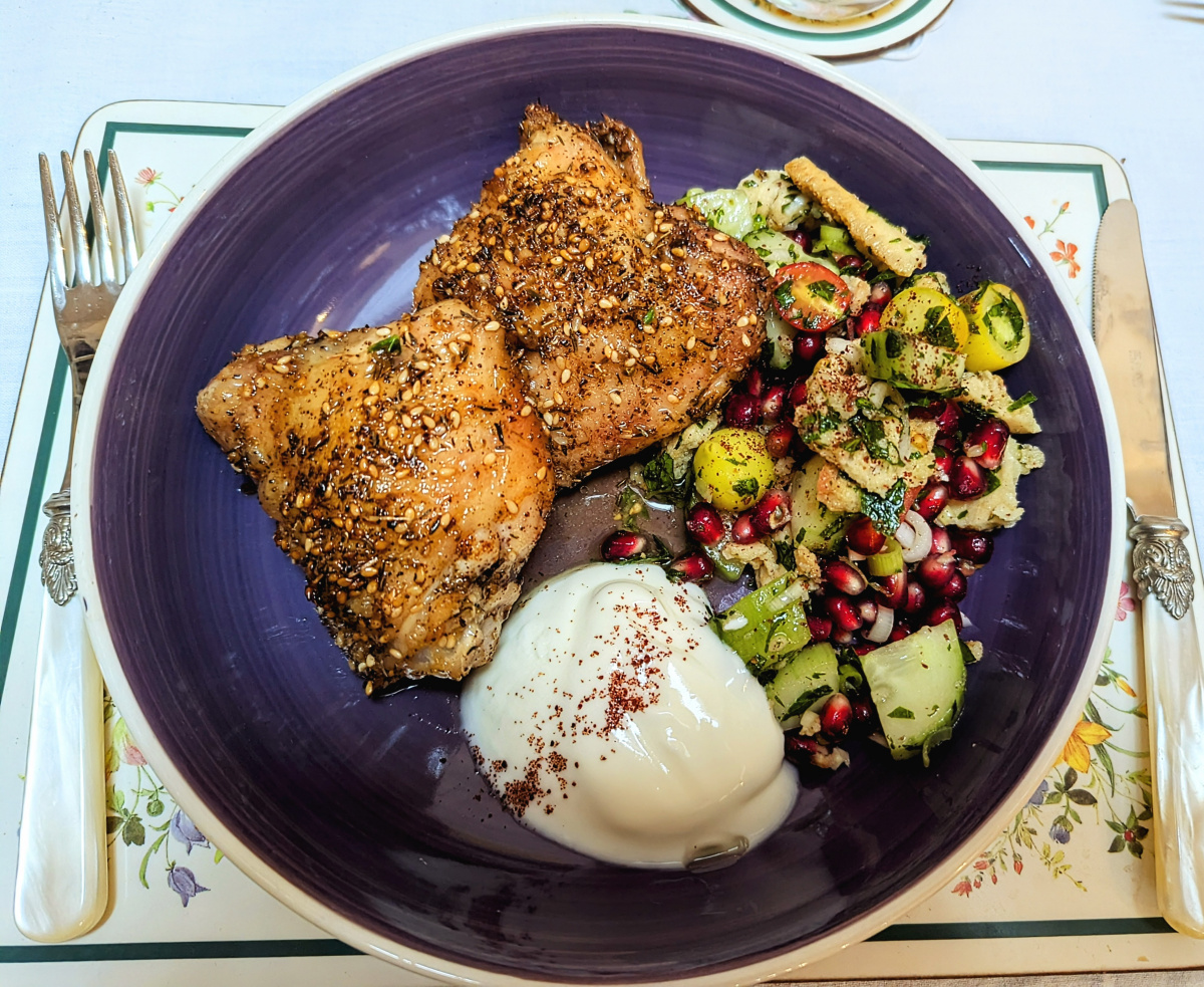 Nigella's Za'atar Chicken With Fattoush! This was my first time making it and it was really delicious. I used chicken thighs and added pomegranate seeds to the fattoush and served with sumac yogurt, and included tomatoes and mint from the garden. My yellow peardrop tomatoes make me smile. I will definitely be making this again! Also featuring my Grandma's tablemats and slightly wonky because I was ready to eat!