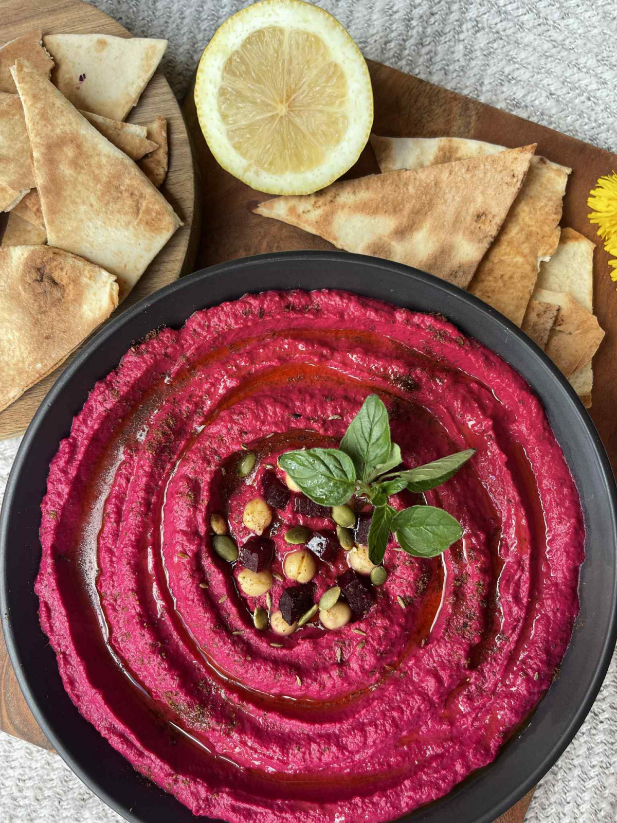 A dip to brighten up any day is Nigella's Beetroot and Chickpea Dip. It is vibrant, uplifting and a delight to eat with fried Lebanese bread to scoop it up alongside a cheese board. It is a very simple and rewarding dip to prepare for a dinner party or lunch where lot of people can share. It is perfect for any occasion. I love this dip recipe!