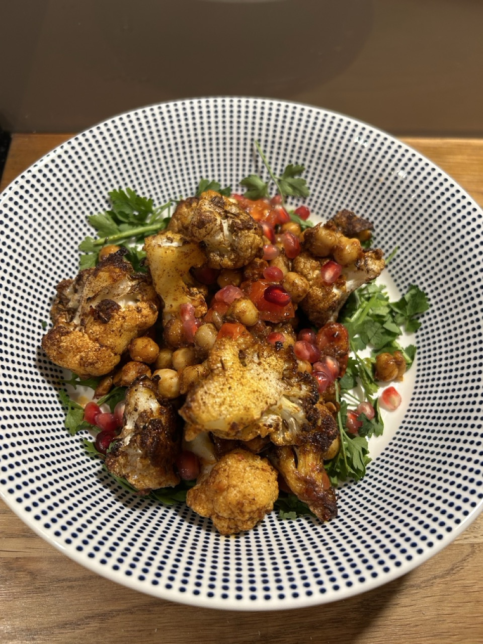 It’s such a pleasure cooking this delicious warm spiced cauliflower with harissa, chickpeas and pomegranate. I’m so busy during the week that cooking can feel like a real chore, but this takes minutes to prepare and I feel so righteous eating it! Monday night totally transformed with this hug in a bowl. Thanks Nigella.