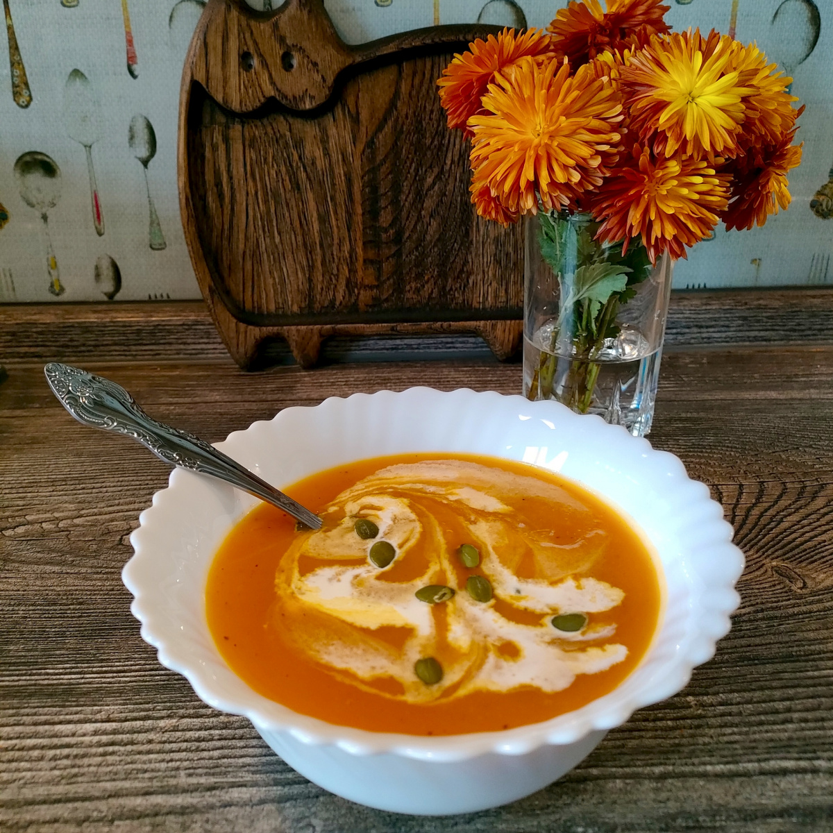 This bright, silky and warming Butternut and sweet potato soup is a must-have in my kitchen every autumn. I added some pumpkin seeds for crunchy trxture and contrasting colors.