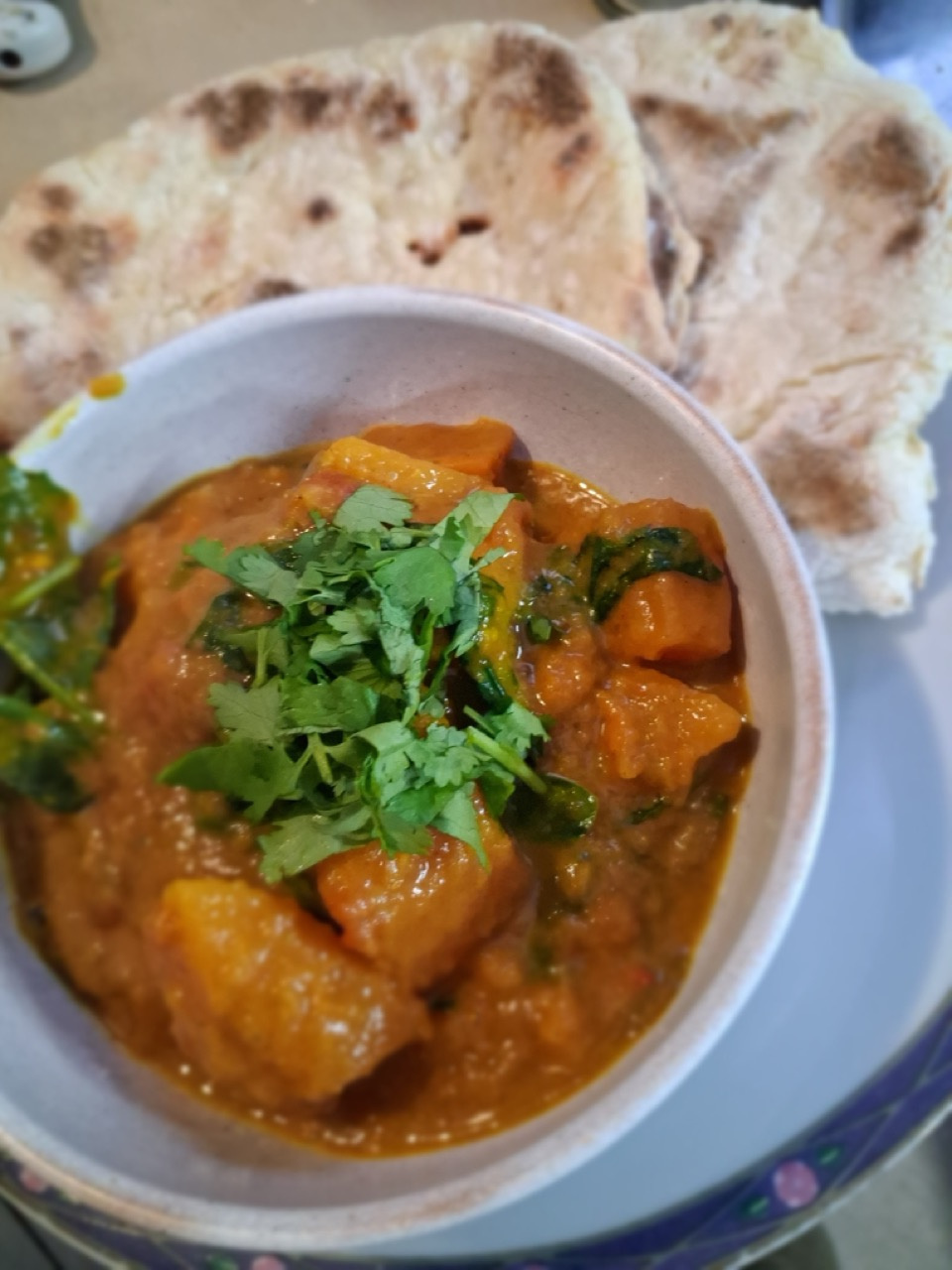 Butternut & sweet potato curry. A delicious Saturday night dinner which we ate with homemade flatbread. The lime spritz & coriander add a lovely freshness. 3 chilli heat level for us!