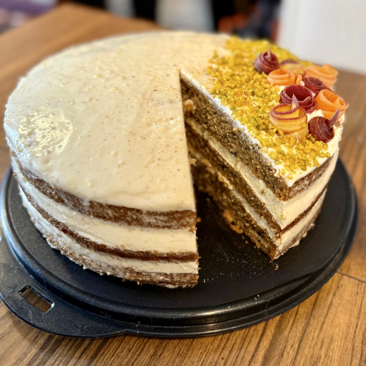 I love Nigellas carrot cupcakes with cream cheese frosting from the domestic goddess book, and did it several times. So I felt safe to turn it into a wedding cake for my cousin. It took me some time to find the perfect amount of dough and creamcheese, but it turned out great. Special are also the different coloured carrots (orange, purple and yellow).