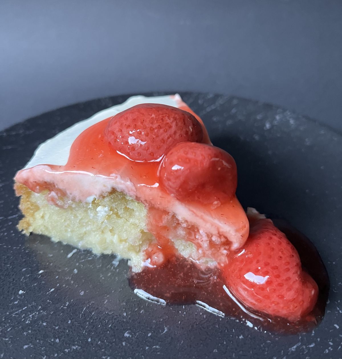 This is Nigella‘s Lemon Tendercake. Instead of blueberries I used frozen strawberries from our garden for the compote. A really lovely cake and super easy to make!