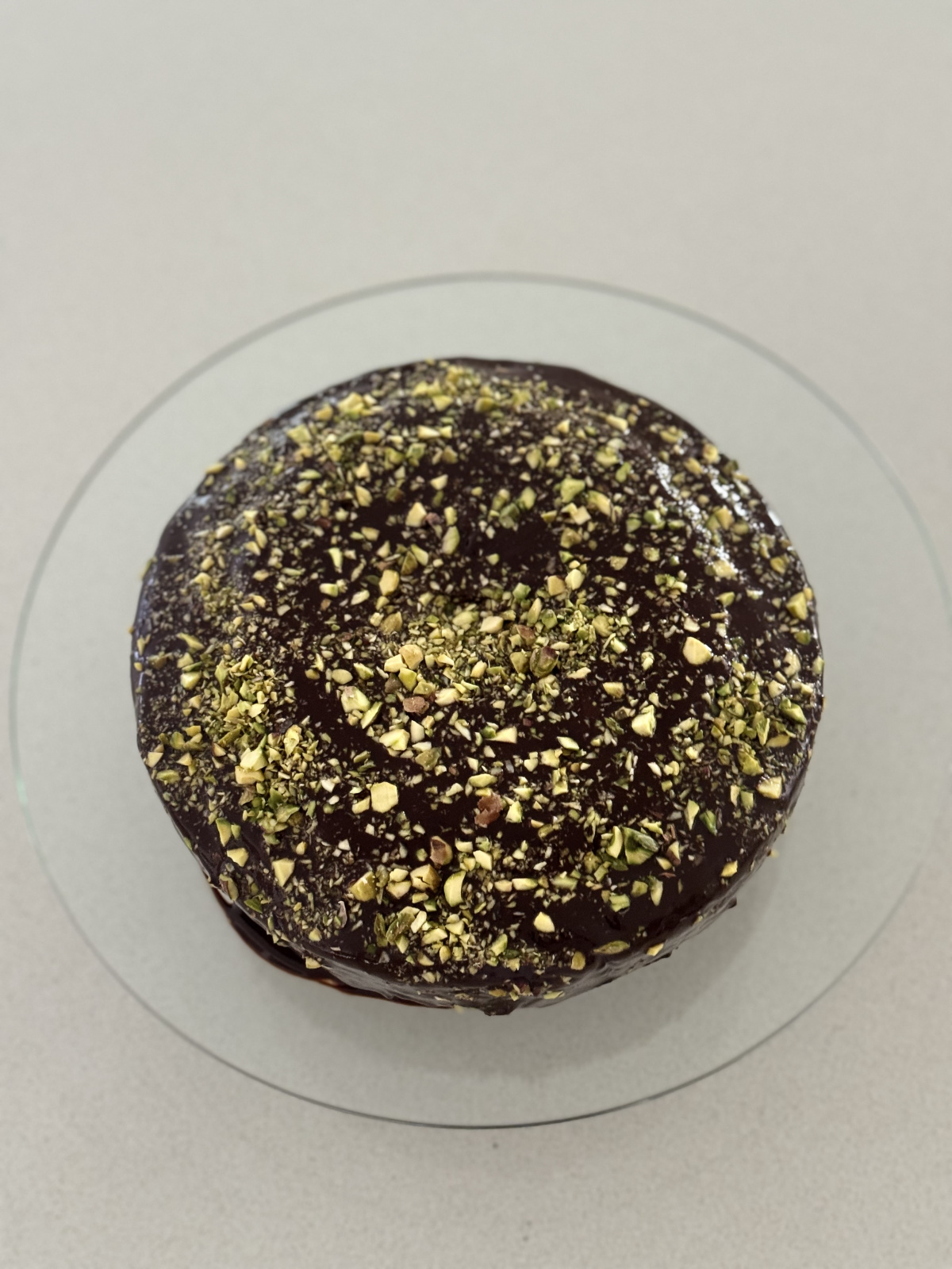 Dark and sumptuous chocolate cake. Looking forward to the tasting. Decadent and rich in colour and ingredients. The green pistachio gives a nice contrast to the dark velvety chocolate icing. Thank you Nigella!