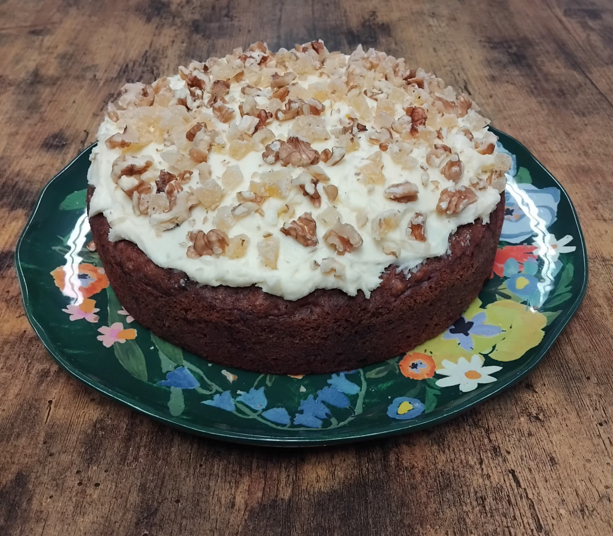 This is my Ginger and Walnut Carrot cake. My daughter absolutely loves this cake. As she is visiting it is ready and waiting. I do add a few more chopped ginger and walnut pieces on top just because we love them.