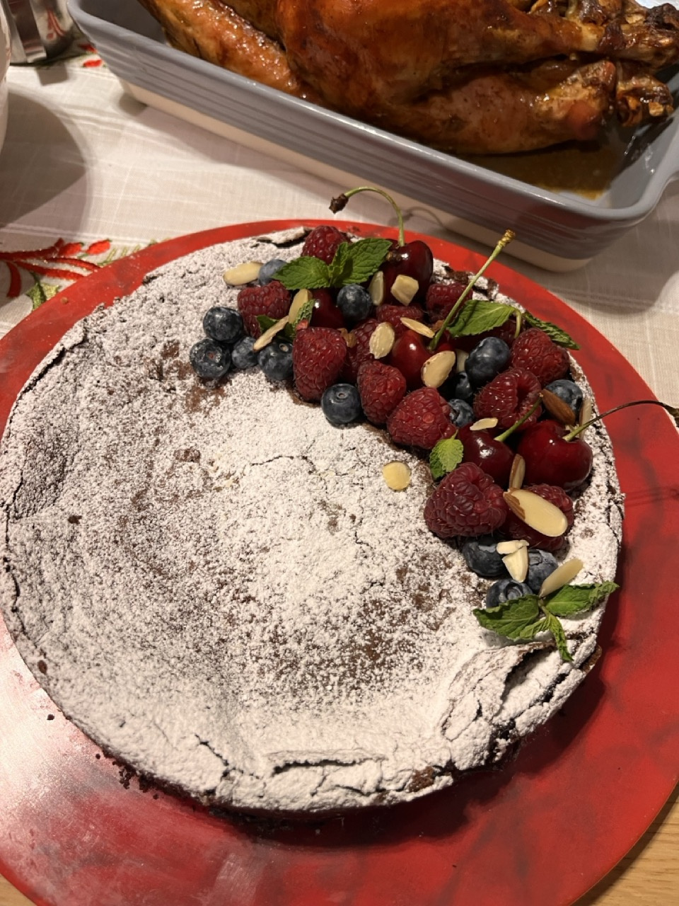 CHOCOLATE CLOUD CAKE for christmas! It is the best gluten-free option and it looks amazing, festively decorated with berries, cherries and mint leaves.