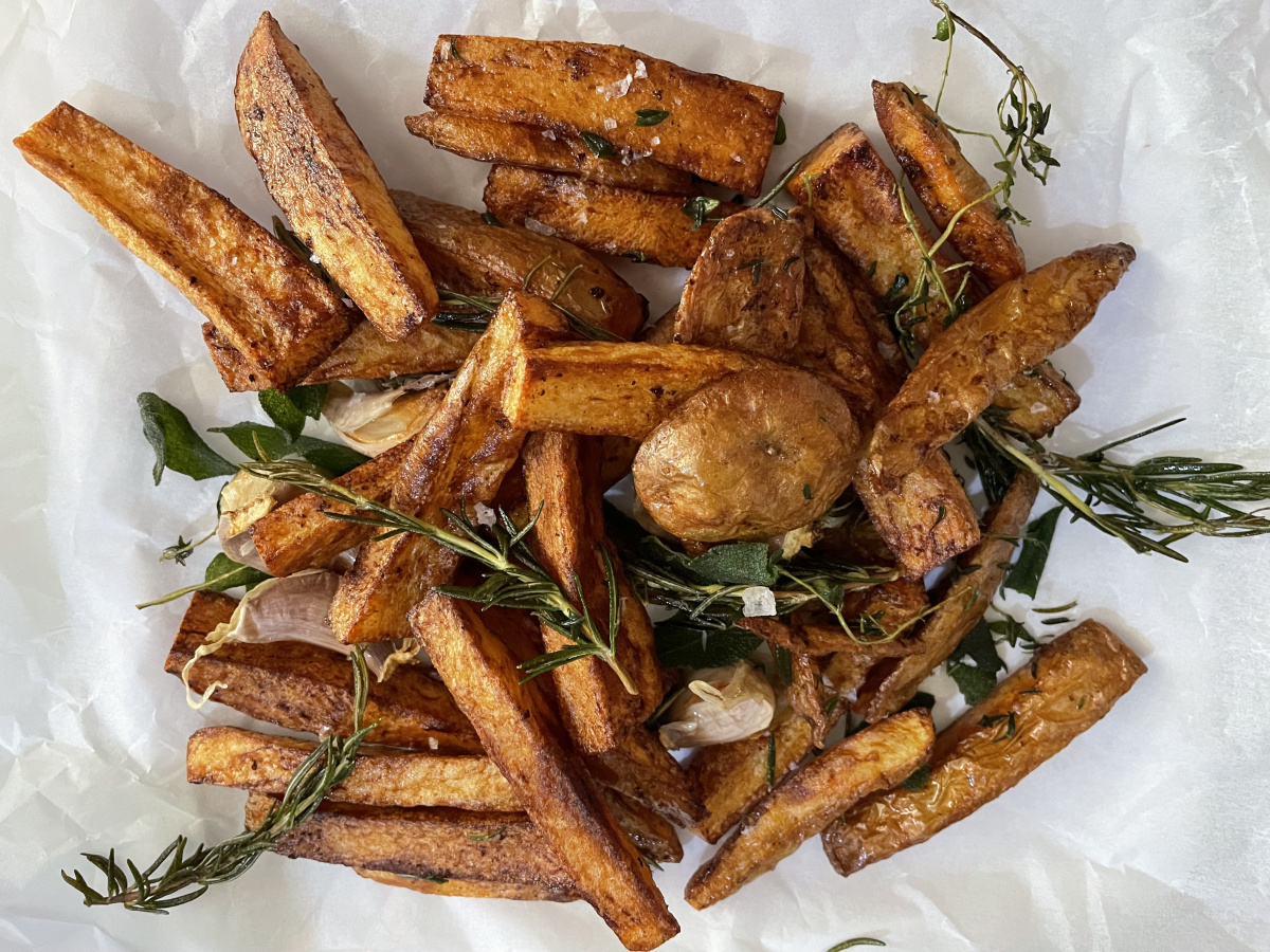 Tuscan fries. The cold oil method is groundbreaking. I added some duck fat to use up the bit left in the fridge from Christmas. The results fill you up with so much joy. I’m using this as my phone wallpaper.