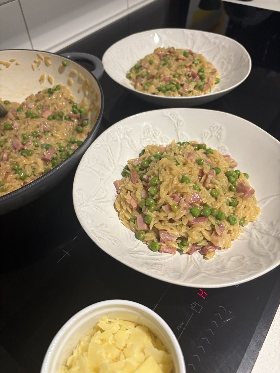 Pasta Risotto with Pea and Pancetta. I don’t add any salt, always use a piece of pancetta and cube myself, a grind of black pepper and a tiny pinch of dried chilli flakes. An absolutely delicious meal