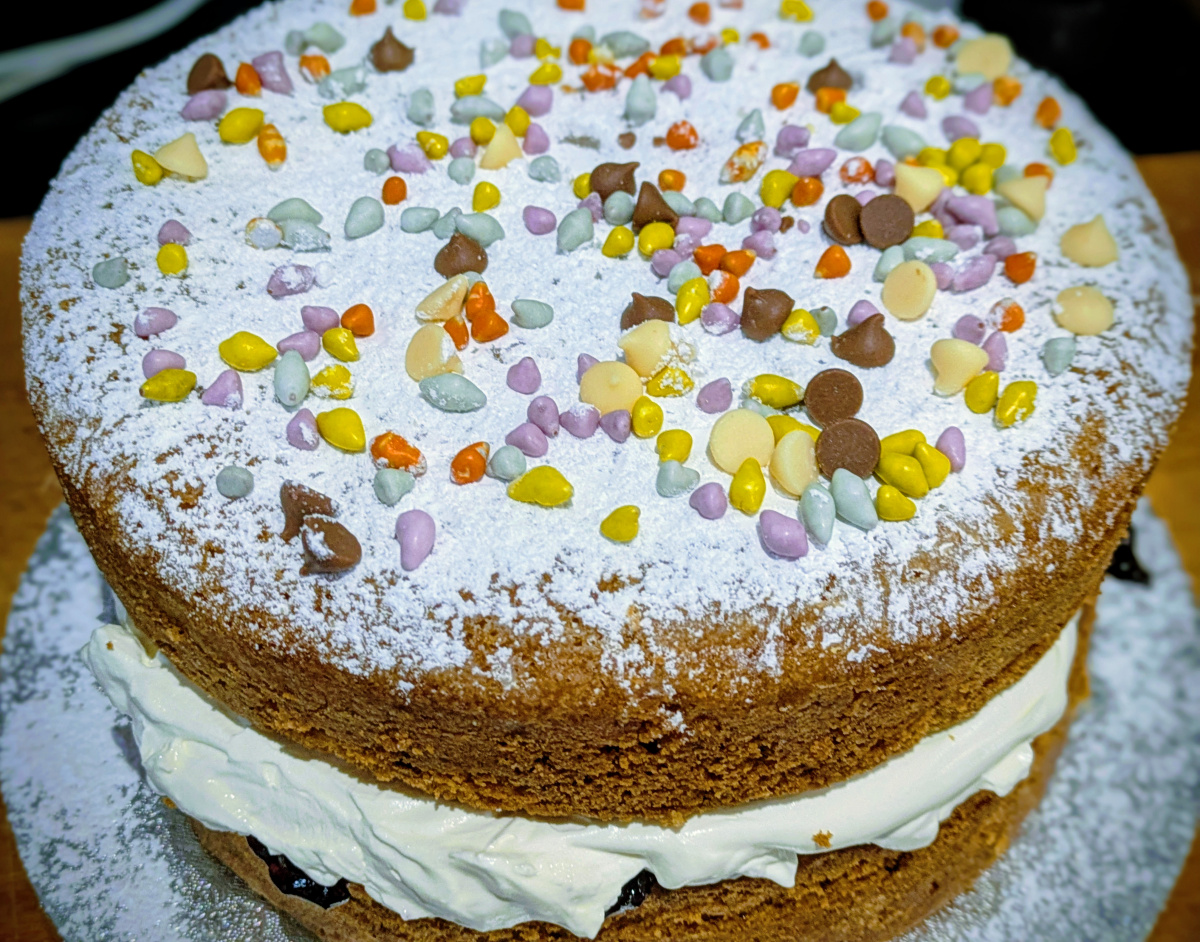 Victoria Sponge with lashings of jam and cream and some pretty sprinkles for a birthday celebration.