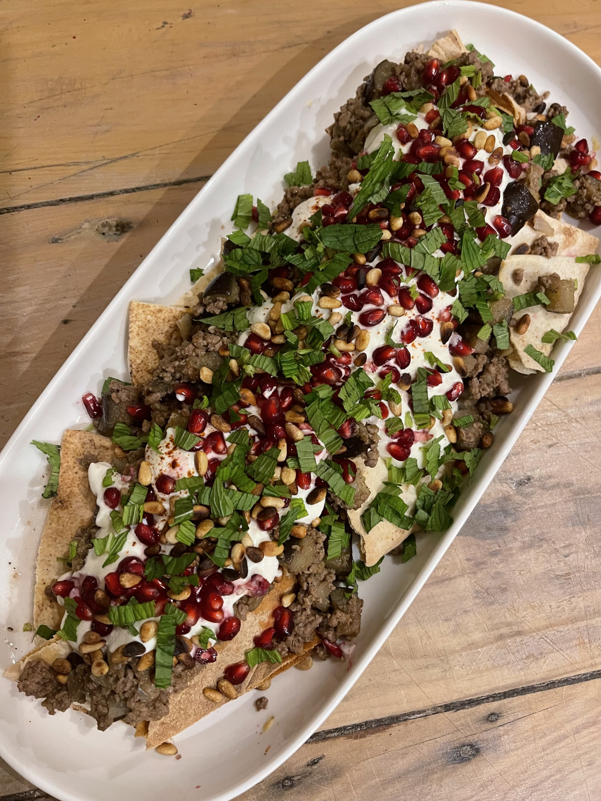 Beef and Aubergine Fatteh. At My Table. Nigella Lawson. I was having friends over for lunch and this was recommended to me by a work colleague. This was the first time I have made it and it has been on repeat many years later. Beautiful flavours. Contrasting textures. Great to just dig in and enjoy! Really lovely.