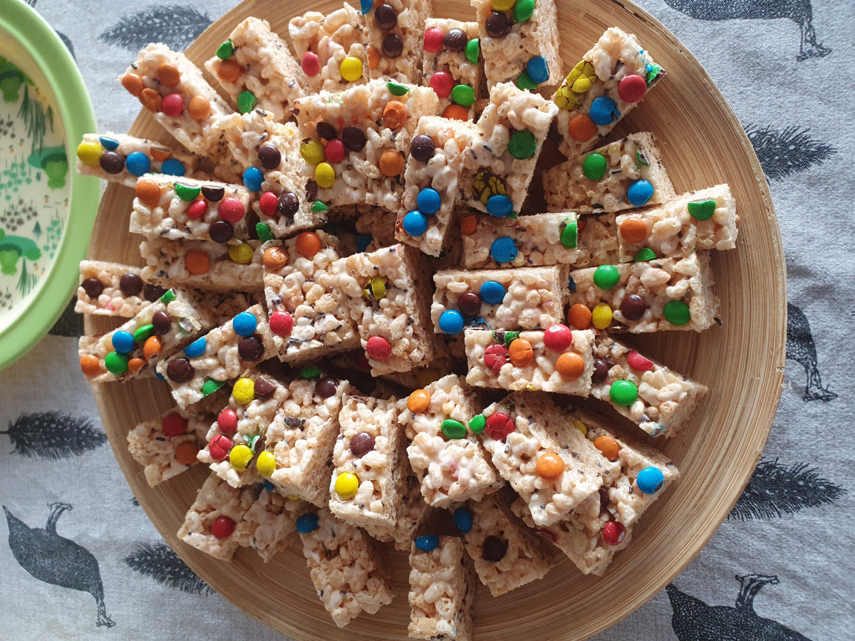 I made the Marshmallow Crispy Squares for a birthday party. As my audience was composed of 6-year olds, I used chocolate candy instead of edible glitter. They were a big hit with the little people, and the adults too!