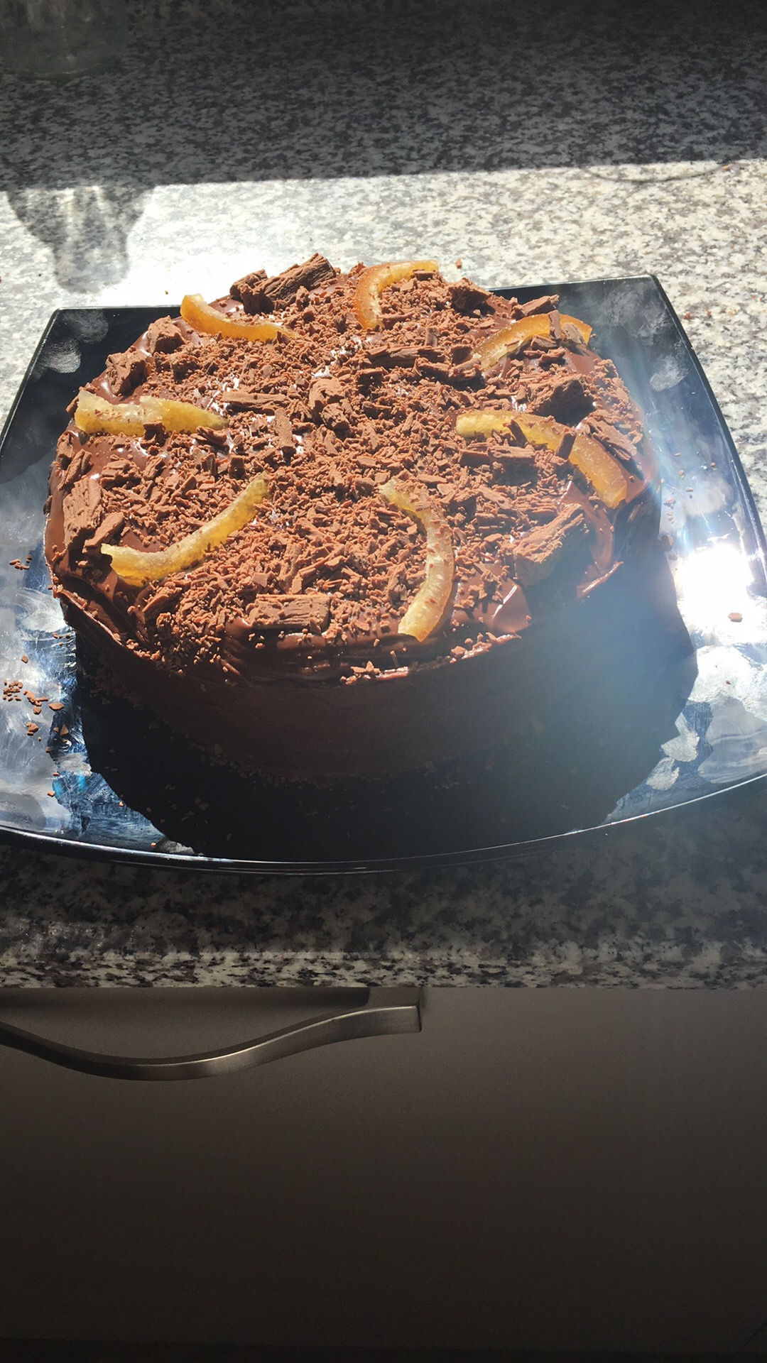 I made Nigella’s Rich Chocolate Cake but used crystallised oranges and a flake for decoration as I didn’t have the blue violet flowers. It was for my friend’s family and he appears in a video eating my cake. He gave it a “So Good” comment.