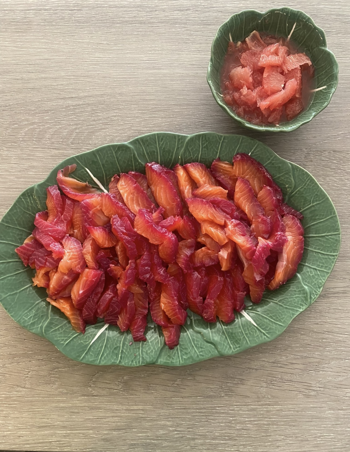 Gravlax sashimi from Nigella Express with some beetroot blended in. Served with some grapefruit and rye bread. Delish!!!